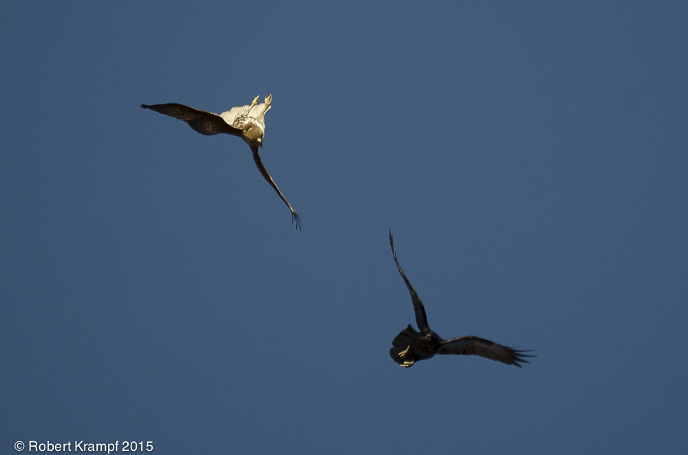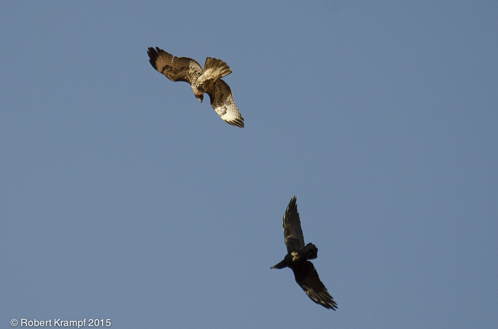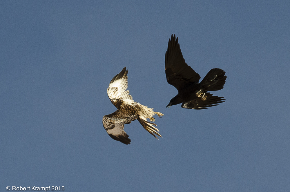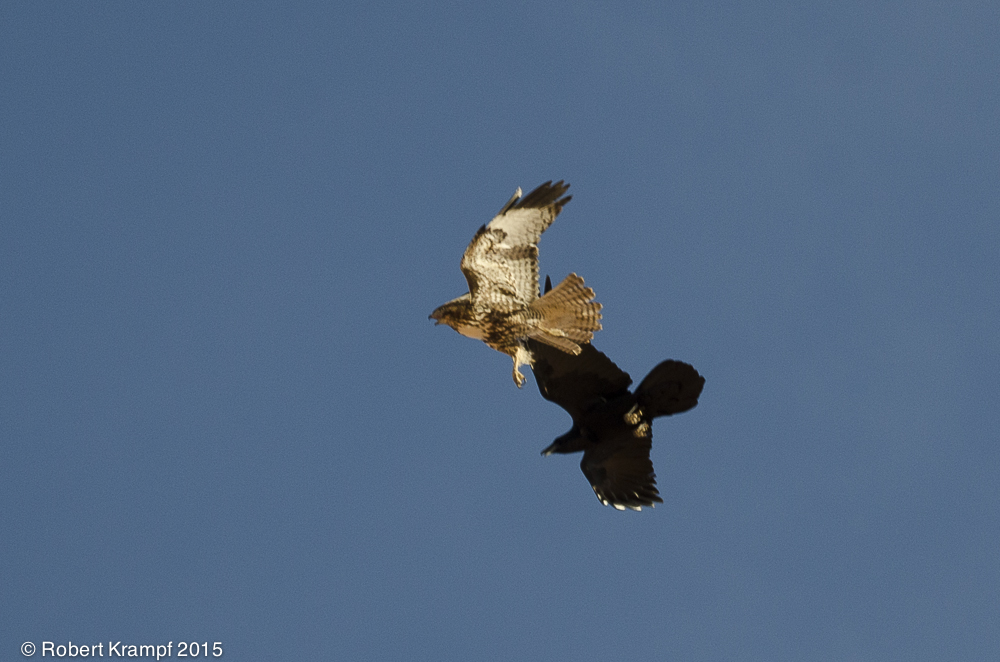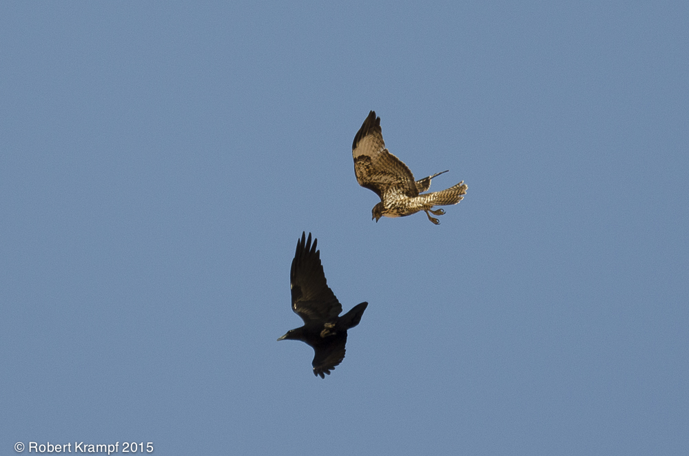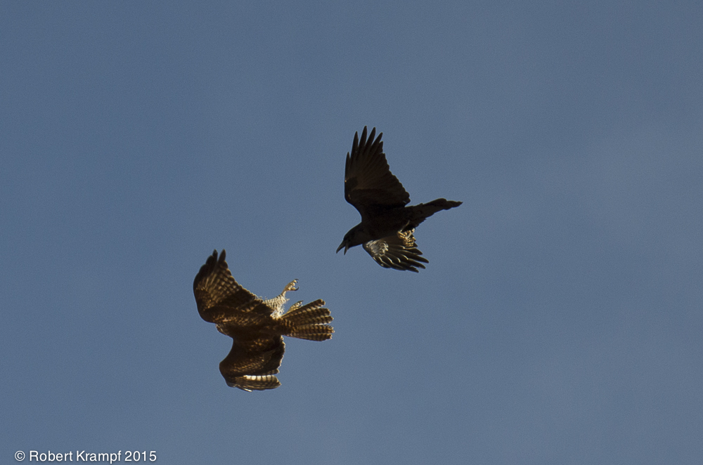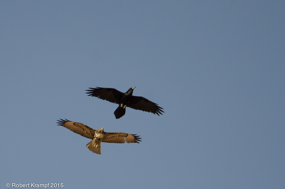 In the photo above, the hawk has flown in front of the raven, and then quickly flipped over to extend its claws.