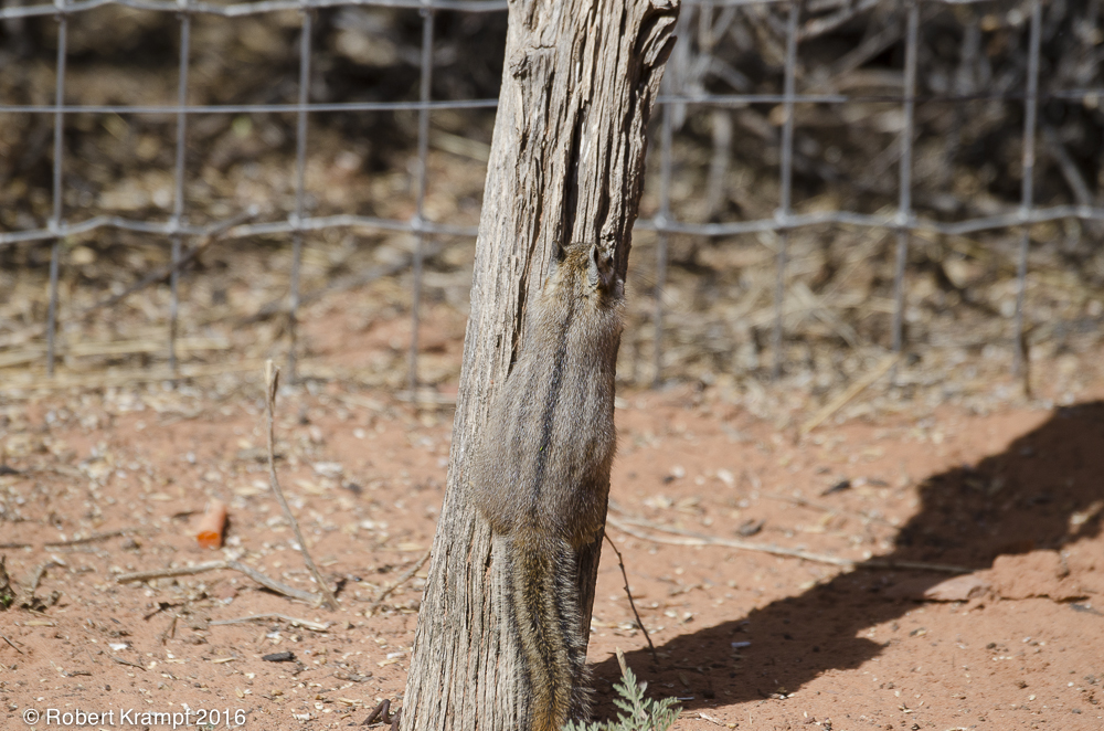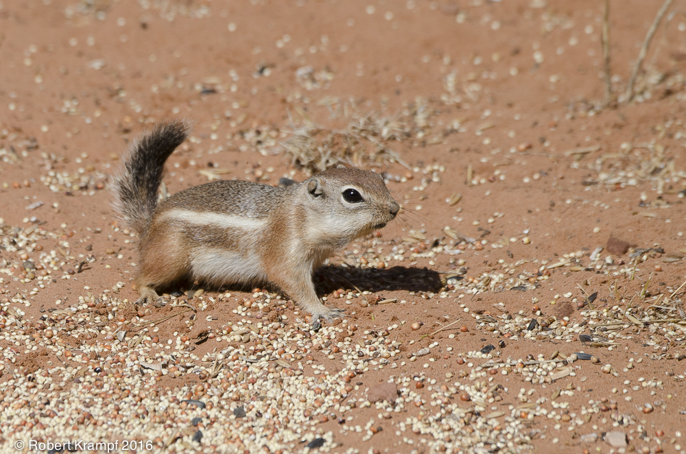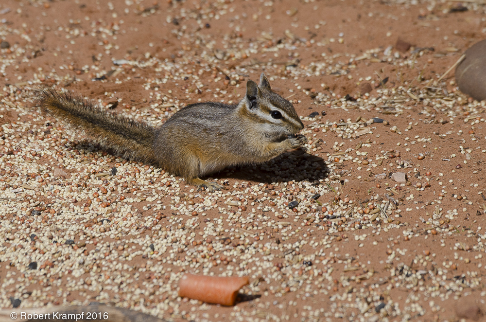 The birdseed brings in lots of birds, but it also attracts a variety of other creatures. This is an antelope squirrel, a very pretty little creature about the same size as a chipmunk.