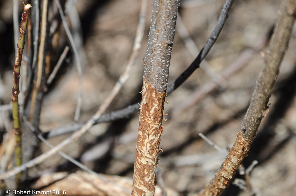 When they run short on carrots, they nibble the bark on the young trees around the house. Luckily, these are side sprouts or "suckers" that would have to be trimmed anyway. The bark of young shrubs and trees is an important source of nutrition for many animals, and for rabbits, the gnawing helps wear down their teeth. Unlike us, a rabbit's front teeth keep growing, and would grow too long if they were not worn down by gnawing.