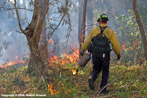 This was taken at the Merritt Island National Wildlife Refuge. He is setting the fire as part of a Prescribed Burn to burn away excess undergrowth and dead plants. Without human intervention, most forests have periodic fires from lightning, etc. In areas where these fires are quickly put out by humans, the undergrowth and dead wood build up.