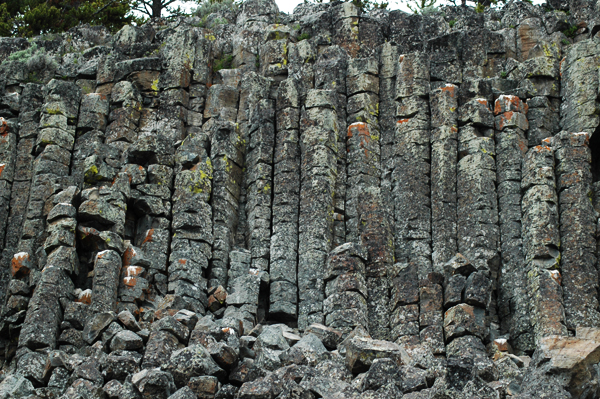 This is columnar basalt. It started as a flow of lava. Like most substances, as the lava cools, it contracts. As the lava contracts, stress builds up, causing vertical fractures that produce the columns.