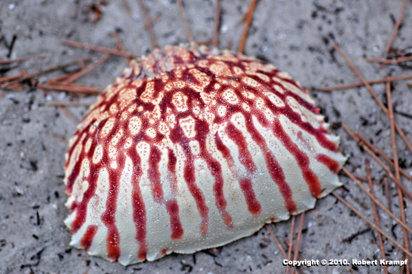 Calico crabs are adapted for life in the surf zone of sandy beaches. This is an area where the sand is constantly being shifted by waves. To live in that area, the Calico Crab has to have a very thin, light shell to let it swim in the surf. The thin shell means that it needs good camouflage, to avoid predators and hide from the animals it eats. The shells are so thin that it is rare to find a whole one. Usually, you only find bits.
