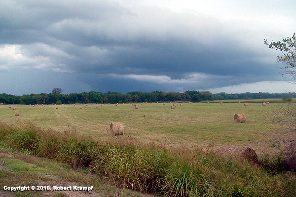 The water droplets in a cloud scatter light in all directions. Since they scatter all wavelengths of light, clouds tend to appear white. Now imagine light entering the top part of the cloud. The light, which would have traveled to the ground is scattered in all directions, which means that less light makes it to the ground, since some of it is being scattered upwards and to the side. As light travels through a cloud, more and more is scattered upwards and to the side, and less and less makes it through to the bottom. The further the light travels through the cloud, the darker the cloud will look. Notice in the photo that the tops of the clouds are white, since the light has not traveled through very much of the cloud.