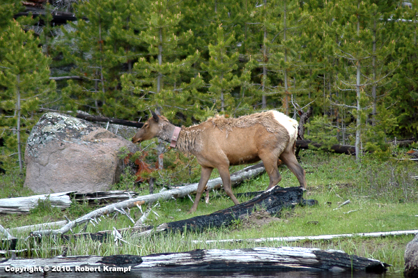The elk lives in Yellowstone National Park. Quite a bit of research is being done there, so it is not unusual to see an elk, bison, or other animals wearing radio tracking collars. Scientists want to monitor how much area they cover, how often they leave the park, feeding habits, etc.