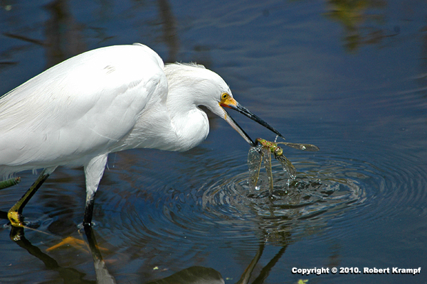 This is a Snowy Egret. The feathers of their breeding plumage are very fluffy, beautiful, white feathers, which were very popular on ladies hats during the late 1800's. At that time, their feathers were worth more than twice their weight in gold. The 1918 Migratory Bird Treaty outlawed using their feathers, which saved them and many other birds from extinction.
