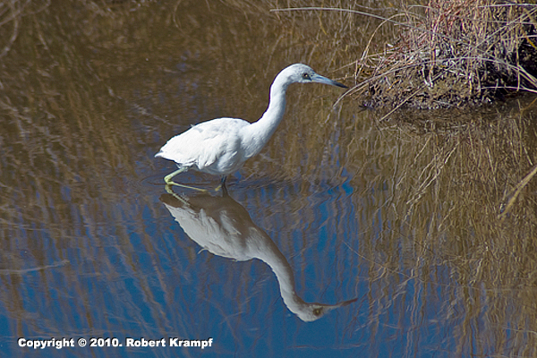This is a Little Blue Heron. For most of their life, they are a dark blue color, and live a solitary life. For their first year, they are white, and they feed with groups of Snowy Egrets.