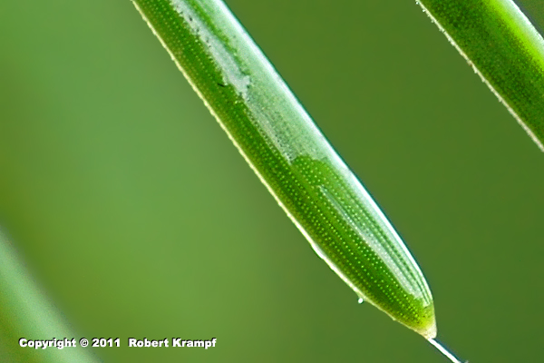 This is a pine needle. The photo was taken in the rain, and the water brought out the details nicely. The rows of light spots are stomata, openings in the leaf that allow gases to move in and out of the leaf. On pine needles, the stomata are lined up in grooves, and recessed, to help cut down on water loss through evaporation.