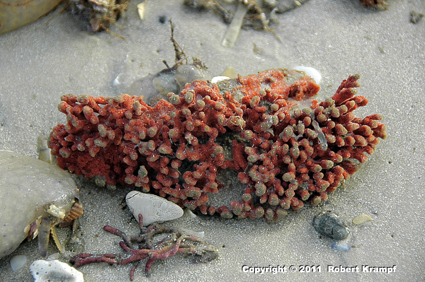 I took this photo on Fort Myers Beach in South Florida. It is a live sponge. There were LOTS of them on the beach after a storm. The sponges that were already dead quickly turned a dark brown.  Inside the sponge is a fibrous network that acts like a skeleton, holding it up, and giving it shape.  When the sponge dies, the remains of the living cells decompose, leaving behind the fibrous material that people think of a s sponge.